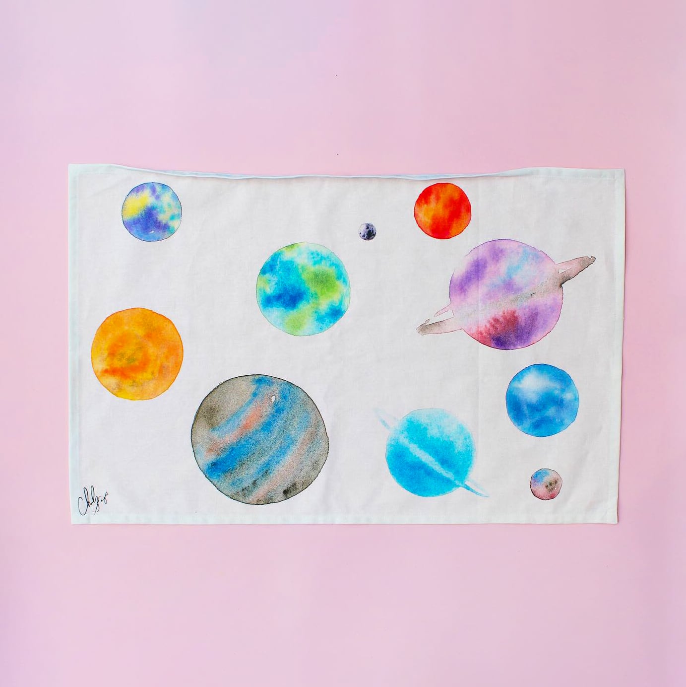太陽系の惑星を散りばめた絵は、宇宙を夢見るこどもたちへ。大きさも色も違うひとつひとつの惑星を見ながら、どこまでも続く空の美しさを感じてもらえたら。」