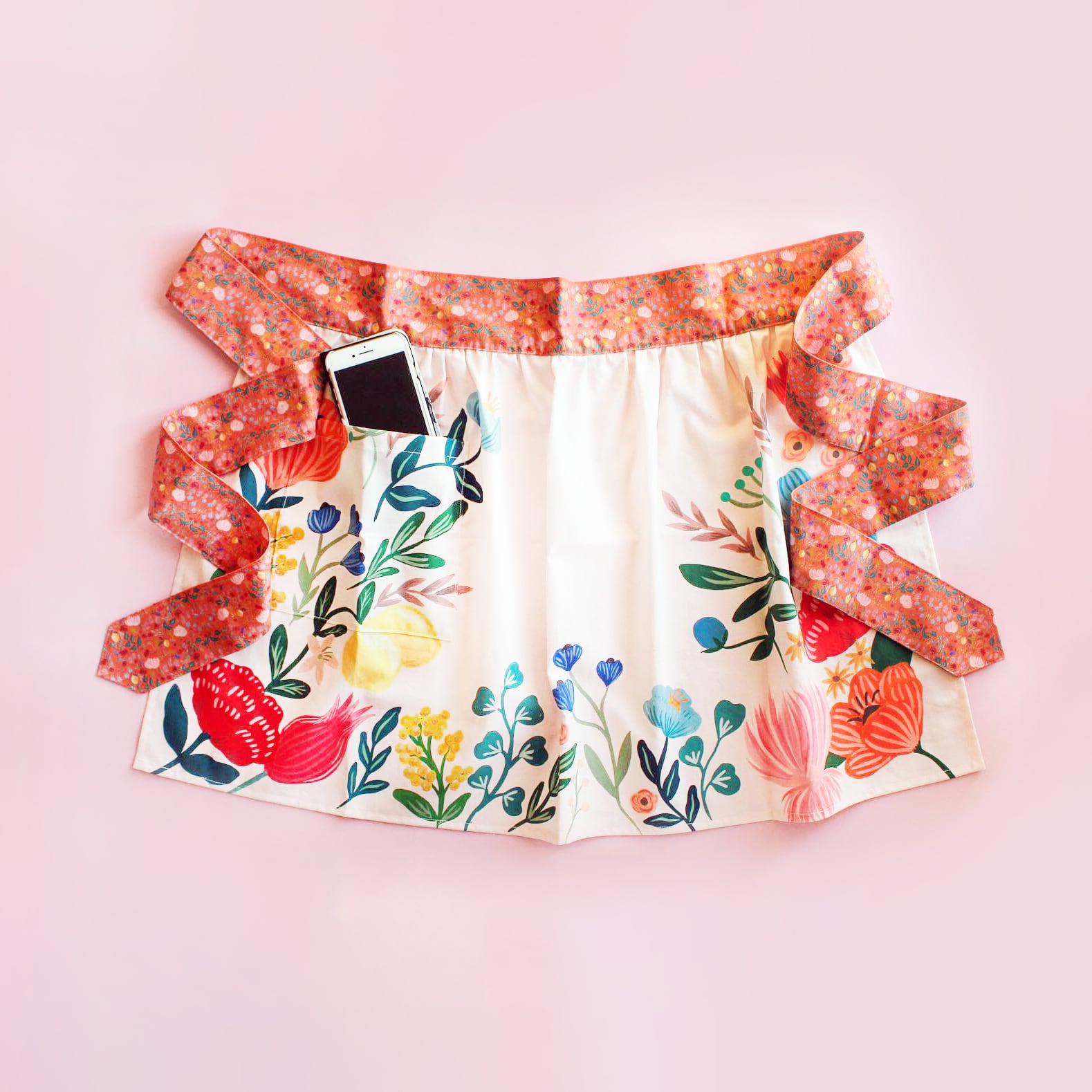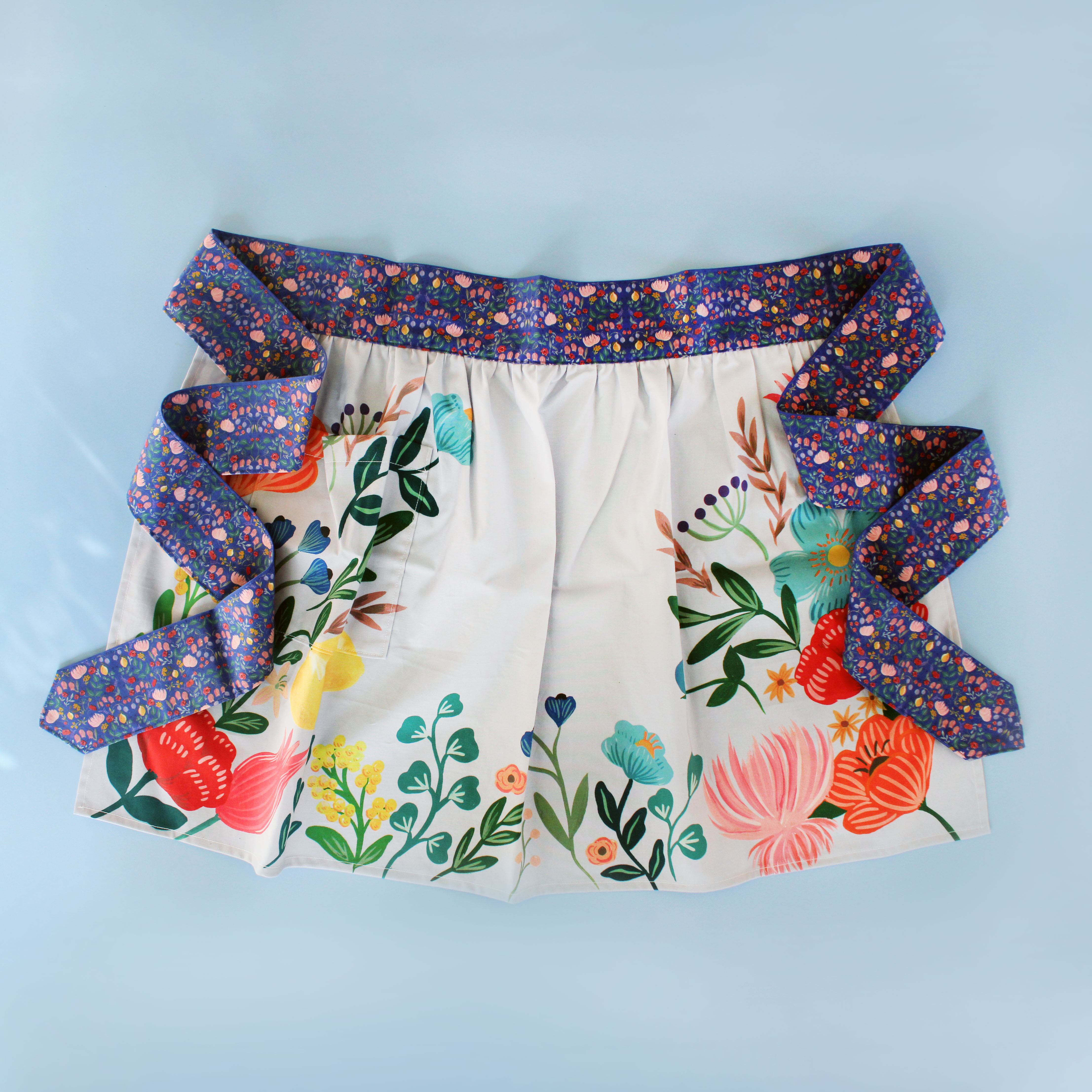 大胆に描かれた、鮮やかな花たちがあしらわれたショートエプロン。